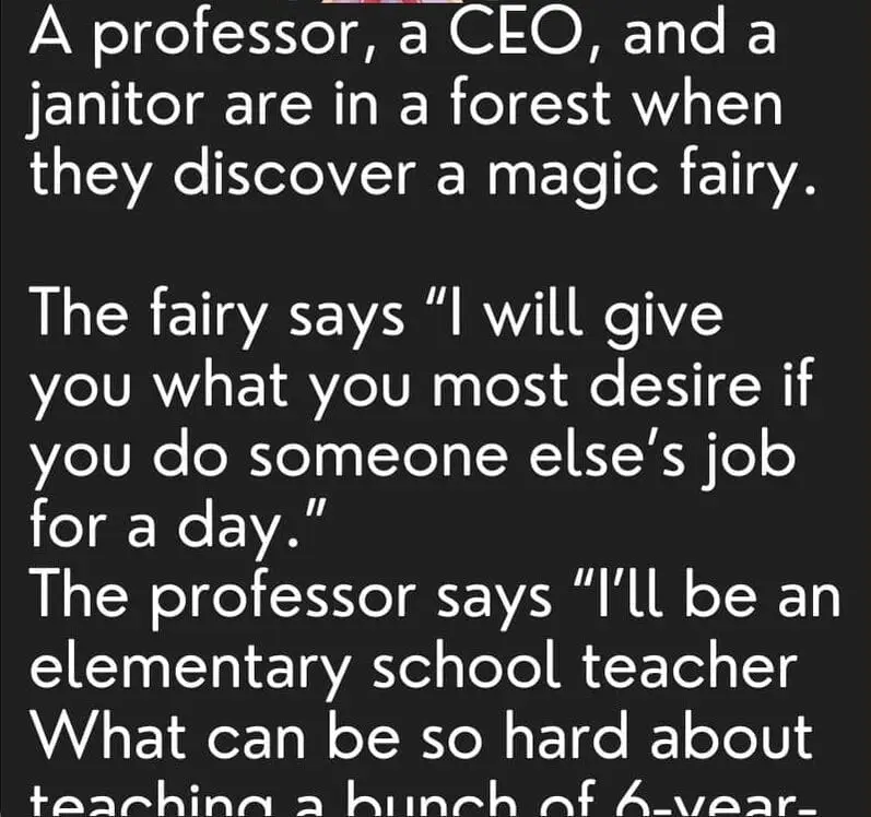A professor, a CEO, and a janitor are in a forest when they discover a magic fairy.