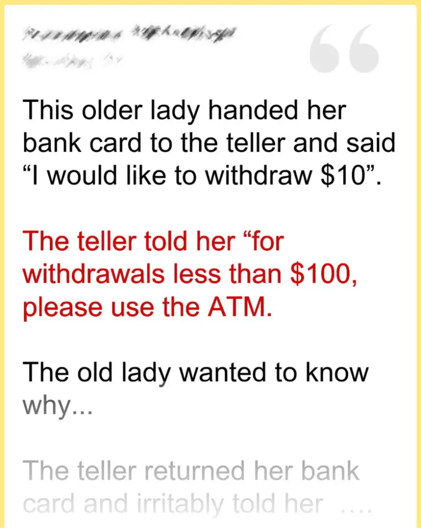The teller told her “for withdrawals less than $100, please use the ATM.