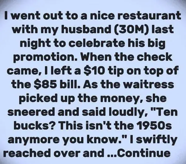 However, the waitress responded with a sneer, saying, “Ten bucks? This isn’t the 1950s anymore.”