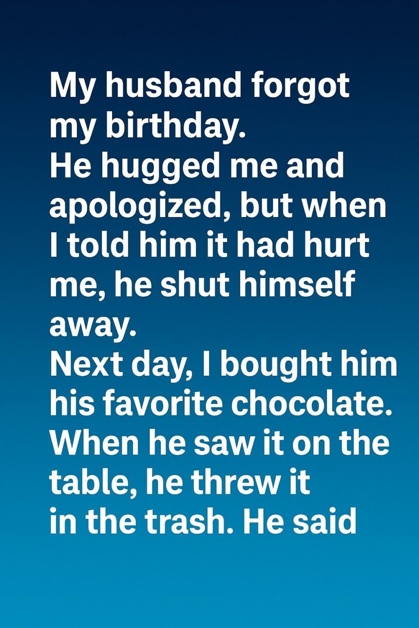 The following morning, he came to me with the chocolate bar from the trash, now cleaned and wrapped with a little ribbon. “I was ashamed,” he said quietly. “But I want to start remembering again — not just your birthday, but everything that makes you smile.” His voice shook, and I saw the man I fell in love with — not perfect, but trying.