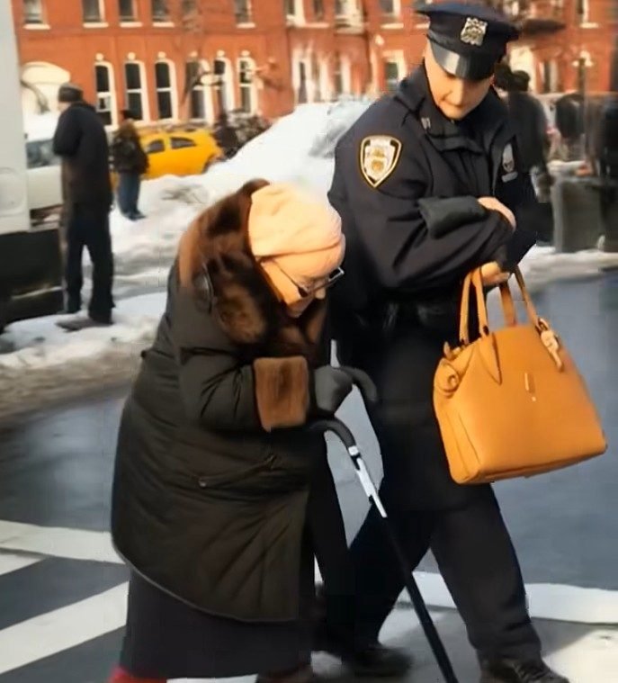 I was late to pick up my niece, stuck at a red light for the third time. Then I saw why: a police officer was helping an elderly woman cross the street slowly and carefully. She wore a heavy brown coat and carried a heavy tote.