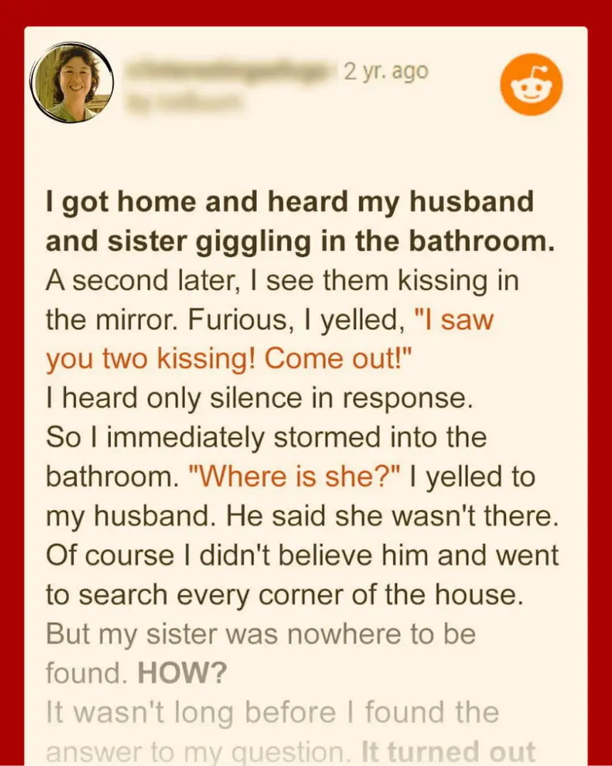 When she peeked in through the slightly ajar door, she saw them kissing in the mirror reflection.Her mind raced, and she took a step back.